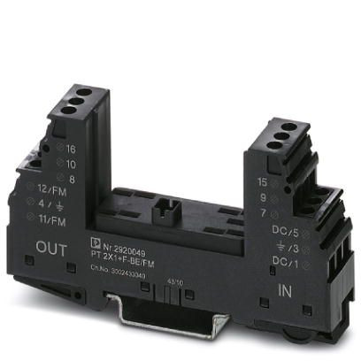Basiselement zur Aufnahme eines Schutzsteckers mit Statusanzeige für zwei Signaladern mit gemeinsamem Bezugspotenzial, integrierte Funkenstrecke für hochohmige Anbindung des Grounds der Stecker-Schutzschaltung an das Erdpotenzial.