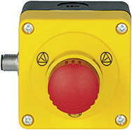 PITestop, Not-Halt/Kontaktblock inkl. Aufbaugehäuse, Set bestehend ausNot-Halt-Taster mit Not-Halt Symbol und Logo und Kontaktblock 2n/c, mitM12 Anschluss 5-polig.