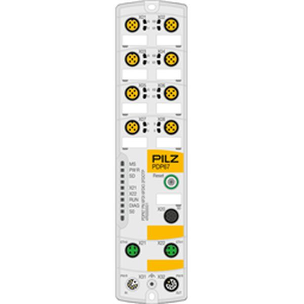 PDP67, Gerät, Schutzart IP67, Steuerungssystem I/O, Failsafe und Standard, 2 M12 Ports, PROFINET IO DEVICE mit PROFIsafe, Conformance Class C (CC-C), PROFIenergy, IRT/RT, Datensatz I&M 0 und 1-4, digitale Ein- und Ausgänge, 6/12 Eingänge, Testtaktausgänge mit 24 V DC 0,25 A, 6/0 Ausgänge, Halbleiter, 0,5 A, einpolig, plusschaltend, kurzschlussfest, überlastsicher, 2 Ausgänge, Halbleiter, 2 A, zweipolig, schaltet nach 24 V (O0+) und 0 V (O0-), kurzschlussfest, überlastsicher, Spannungsversorgung, Einspeisung Device Supply 24 V DC XX A, Einspeisung Load Supply 24 V DC 8/16 A, Potentialtrennung, Anschluss Funktionserde
