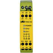 LED-Anzeigen für Schaltzustand Kanal 1/2 und Versorgungsspannung. Sicherheitsschaltgerät (standalone), Eingänge: Je Taster 1 S, 1 Ö,Ausgänge: 2 S, 1 Ö, UB = 24 V DC, Breite: 22,5 mm, Schraubklemmenintegriert, Zweihandbediengerät, Überwachung der Gleichzeitigkeit beiZweihandtaster.