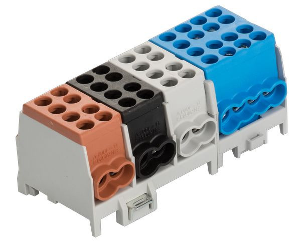 1 x braun / brown / brune,1 x schwarz / black / noir,1 x grau / grey / gris,1 x blau / blue / bleu,mehrpolig, Schnellbefestigung aus Stahlblech, Doppel-Schnellbefestigung bei 4- u. 5-pol., Minimodular kompatibel, VDE-zertifiziert, multipole, quick snap-on, galvanized steel, 2-fold locking for 4- and 5-pole, extendable with the mini modular range, VDE certified,multi polaire, attache rapide d‘acier galvanisé,2 attaches rapide pour 4 et 5 pôle, compatible avec le système mini-modulaire,certifié par VDE