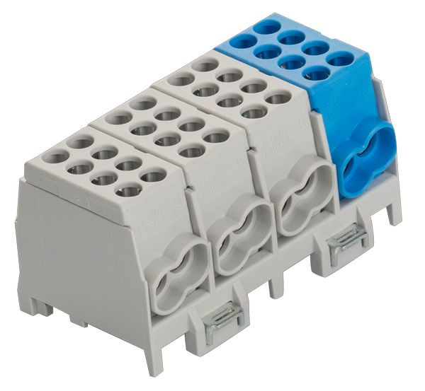 3 x grau / grey / gris, 1 x blau / blue / bleu, mehrpolig, Schnellbefestigung aus Stahlblech, Doppel-Schnellbefestigung bei 4- u. 5-pol., Minimodular kompatibel, multipole, quick snap-on, galvanized steel, 2-fold locking for 4- and 5-pole, extendable with the mini modular range, multi polaire, attache rapide d‘acier galvanisé, 2 attaches rapide pour 4 et 5 pôle, compatible avec le système mini-modulaire,