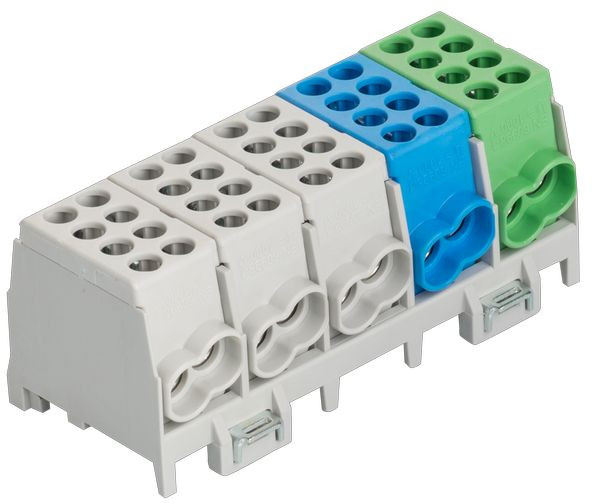 3 x grau / grey / gris, 1 x blau / blue / bleu, 1 x grün / green / vert, mehrpolig, Schnellbefestigung aus Stahlblech, Doppel-Schnellbefestigung bei 4- u. 5-pol., Minimodular kompatibel, multipole, quick snap-on, galvanized steel, 2-fold locking for 4- and 5-pole, extendable with the mini modular range, multi polaire, attache rapide d‘acier galvanisé, 2 attaches rapide pour 4 et 5 pôle, compatible avec le système mini-modulaire,