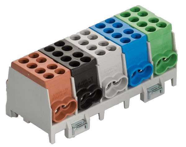 1 x braun / brown / brune, 1 x schwarz / black / noir,1 x grau / grey / gris,1 x blau / blue / bleu,1 x grün / green / vert,mehrpolig, Schnellbefestigung aus Stahlblech, Doppel-Schnellbefestigung bei 4- u. 5-pol., Minimodular kompatibel, VDE-zertifiziert multipole, quick snap-on, galvanized steel, 2-fold locking for 4- and 5-pole, extendable with the mini modular range, VDE certified,multi polaire, attache rapide d‘acier galvanisé,2 attaches rapide pour 4 et 5 pôle, compatible avec le système mini-modulaire, certifié par VDE