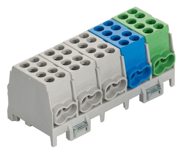 3 x grau / grey / gris,1 x blau / blue / bleu,1 x grün / green / vert,mehrpolig, Schnellbefestigung aus Stahlblech, Doppel-Schnellbefestigung bei 4- u. 5-pol., Minimodular kompatibel, VDE-zertifiziert, multipole, quick snap-on, galvanized steel, 2-fold locking for 4- and 5-pole, extendable with the mini modular range, VDE certified, multi polaire, attache rapide d‘acier galvanisé,2 attaches rapide pour 4 et 5 pôle, compatible avec le système mini-modulaire, certifié par VDE
