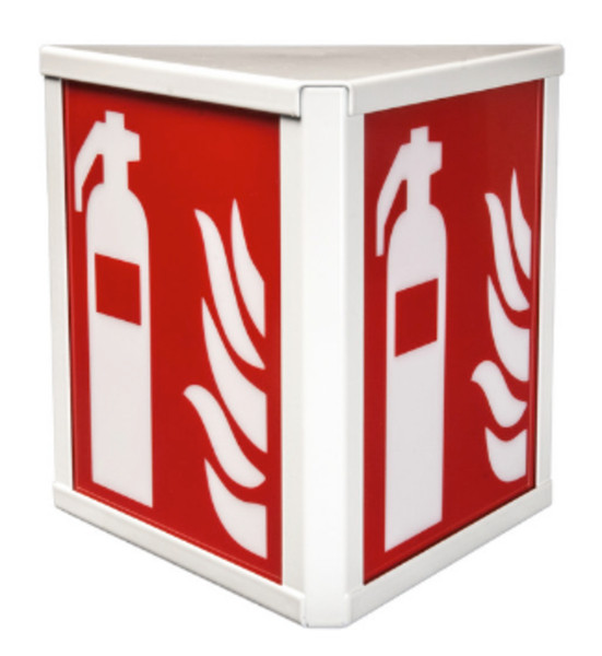 Kombinierte Sicherheitszeichen-/Sicherheitsleuchte, Gehäuse aus flachen Stahlblech-Profilen mit eckigen Konturen in dreieckiger Form, 2-seitige Kennzeichnung von Sicherheitseinrichtungen durch wechselbare Sicherheitszeichenscheiben (bitte separat bestellen), Beleuchtung von Sicherheitseinrichtungen mit 5 lx durch High-Power-LED mit Lichtlenkung durch spezielle Linse