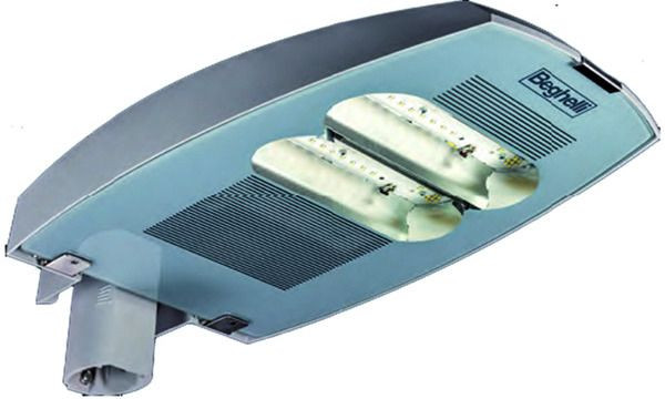 Strassen- und Wegeleuchte: Gehäuse aus druckgegossenem Aluminium und Scheibe aus Hartglas. Gehäuseober- und Gehäuseunterteil mit Scharnieren verbunden und durch Edelstahl-Verschlüsse verschlossen. Lichtlenkung durch segmentierte Reflektoren aus hochglänzendem Aluminium, asymmetrisch breitstrahlend oder asymmetrisch extrem breitstrahlend für Strassen und asymmetrisch extrem breitstrahlend für Wege. Integrierter SmartDriver als LED-Driver mit: Dimmung von 0 % bis 100 %, Speicherung des Energieverbrauches, Speicherung der Betriebsstunden. Version für Mastaufsatz oder Mastansatz.