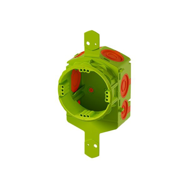 Die innovative und schnelle Möglichkeit zur Installation von Hohlwanddosen im Trockenbau. Die UniQ Hohlwand Geräte-V-Dose wird von hinten durch die Bohrung in Holzständerwänden oder Rigips gesetzt. Die Wand ist daher noch offen und Leitungen sowie Rohre können bequem eingeführt werden. Fixierungslamellen sorgen für den festen Halt im Baumaterial, zusätzlich kann die Geräteverbindungsdose über Nägel, Tacker oder Schrauben fixiert werden. Die halogenfrei und luftdichte Schalterdose bietet durch den Durchmesser von 74 mm, die sechseckige Bauform und der Tiefe von 73 mm deutlich mehr Klemmraum als andere Produkte. Außerdem können die Installationsdosen bei Mehrfachkombinationen im genormten Kombinationsabstand von 71 mm fest miteinander verbunden werden. Die SCS-Verbindungstechnik mit großflächiger Verbindungsmembran inklusive Cable-Plopp-Technik ermöglicht anschließend ein einfaches Durchverdrahten. Das verkürzt die Verarbeitungszeit zusätzlich. Drei Schraubdome auf allen vier Seiten garantieren die gerade Montage durch individuelle Ausrichtung der Geräte.