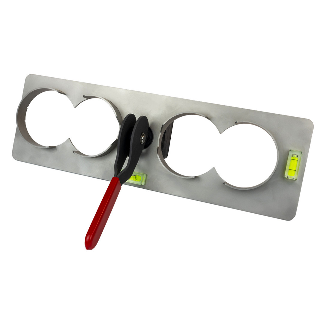 Die Unterputz Bohrschablone 5-fach ermöglicht Ihnen perfekte Bohrlöcher für 5-fach-Kombinationen in kürzester Zeit. Sie ist die ideale Ergänzung für die Umsetzung des Thermodosen Systems: die Bohrhilfe aus hochwertigem Edelstahl garantiert Dosenfräsungen mit einem Standardbohrlochabstand von 71mm in einer Flucht. Die Erstellung von Mehrfachkombinationen gelingt mit nur einer Einmessung im Handumdrehen. Die Bohrhilfe wird durch die Schnellspannfunktion im bereits eingebrachten mittleren Loch befestigt und mithilfe integrierter Wasserwaagen ausgerichtet. Die wiederverwendbare Bohrschablone eignet sich für alle Mauerwerke, wie Ytong, Ziegel, Kalksandstein und andere Mauerwerke. Für die Hohlwandinstallation empfehlen wir die Primo Bohrschablone Hohlwand.