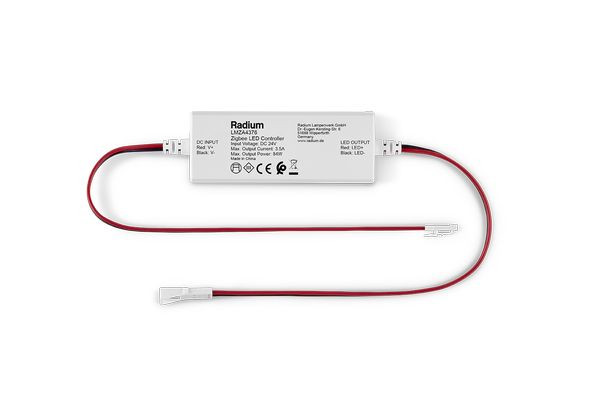 Ein-Kanal-Dimmer zur Steuerung der Helligkeit von weißem Licht mit Zigbee (z.B. Fernbedienung/ Smarthome), bis max. 84W Steuerlast im 12-24V-Bereich.