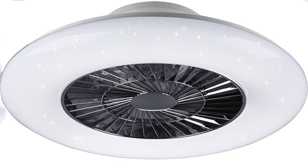 LED Deckenleuchte Visby mit eingebautem Ventilator, 3 Geschwindigkeiten, inkl. Fernbedienung. Leuchte mit Nachtlichtfunktion, Lichtfarbe stufenlos einstellbar, mit Starlighteffekt und integrieten Dimmer. Kunststoff weiß/chrom, EEK: A