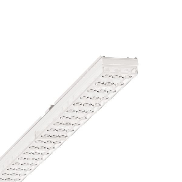Geräteträger aus verzinktem, profiliertem Stahlblech mit Zinkauflage kombiniert mit Polyesterharzlack gewährleisten einen guten Korrosionschutz, Werkzeuglose Befestigung mit design-integrierten Druckverschlüssen gewährleisten einen Diebstahl- und Demontageschutz. Integrierte Stirnseiten aus Kunststoff mit Dichtlippen und eine umlaufend geschlossene Dichtung zur Tragschiene für Schutzart bis IP64. Lichtverteilung direkt doppelt asymmetrisch strahlend mittels Individual.Lens.Optic aus Kunststoff PMMA, die Einzellinsenoptik enthält eine transparente Dichtung, sorgt für eine hohe Montagefreundlichkeit und ist wartungsfreundlich durch leicht zu reinigende Oberfläche. Der Rhythmus der 3-reihigen Einzellinsen-Anordnung ist innerhalb und Geräteträger übergreifend perfekt aufeinander abgestimmt und gewährleistet ein homogenes Erscheinungsbild im Objekt. Geeignet für Bildschirmarbeitsplätze, rundumentblendet 65° < 3000 cd/qm nach aktueller Norm DIN-EN 12464-1. Wärmebeständige Leitungen einschließlich festpositioniertem 5-poligen Schnellmontage-Steckerteil mit werkzeugloser Phasenvorwahl und Suchfinger.