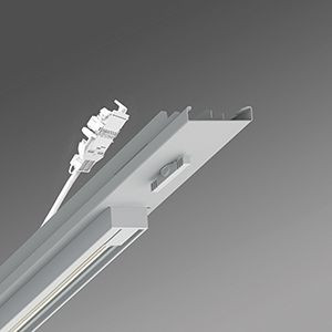 Geräteträger-Einsatz mit integrierter Universal-Dreiphasenstromschiene mit Dali (nutzbare Länge 280 mm) aus verzinktem, profiliertem Stahlblech zur Kombination von Akzent- und Allgemeinbeleuchtung, Oberfläche mit Polyesterharzlack beschichtet, mit zwei Drehverschlüssen für das schnelle Einsetzen in die Tragschiene. In der Tragschiene variabel positionierbar. Gehäusefarbe silbergrau/weißaluminium RAL 9006. Elektrische Verbindung mittels Anschlussleitung 0,7 m zur variablen Geräteträgerpositionierung im Lichtband mit 5-poligen Schnellmontage-Steckerteil mit freier Phasenvorwahl.