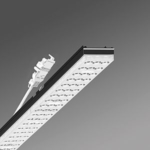 Geräteträger aus verzinktem, profiliertem Stahlblech mit Zinkauflage kombiniert mit Polyesterharzlack gewährleisten einen guten Korrosionschutz, Werkzeuglose Befestigung mit design-integrierten Druckverschlüssen gewährleisten einen Diebstahl- und Demontageschutz. Integrierte Stirnseiten aus Kunststoff mit Dichtlippen und eine umlaufend geschlossene Dichtung zur Tragschiene für Schutzart bis IP64. In der Tragschiene variabel positionierbar. Gehäusefarbe schwarz RAL 9005. Lichtverteilung direkt breitstrahlend mittels Individual.Lens.Optic aus Kunststoff PMMA, die Einzellinsenoptik enthält eine transparente Dichtung, sorgt für eine hohe Montagefreundlichkeit und ist wartungsfreundlich durch leicht zu reinigende Oberfläche. Der Rhythmus der 3-reihigen Einzellinsen-Anordnung ist innerhalb und Geräteträger übergreifend perfekt aufeinander abgestimmt und gewährleistet ein homogenes Erscheinungsbild im Objekt. Elektrische Verbindung mittels Anschlussleitung 1 m zur variablen Geräteträgerpositionierung im Lichtband mit 3-poligen Schnellmontage-Steckerteil mit freier Phasenvorwahl.