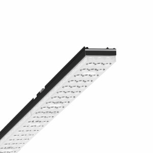 Geräteträger aus verzinktem, profiliertem Stahlblech mit Zinkauflage kombiniert mit Polyesterharzlack gewährleisten einen guten Korrosionschutz, Werkzeuglose Befestigung mit design-integrierten Druckverschlüssen gewährleisten einen Diebstahl- und Demontageschutz. Integrierte Stirnseiten aus Kunststoff mit Dichtlippen und eine umlaufend geschlossene Dichtung zur Tragschiene für Schutzart bis IP64. Gehäusefarbe schwarz RAL 9005. Lichtverteilung direkt tiefstrahlend mittels Individual.Lens.Optic aus Kunststoff PMMA, die Einzellinsenoptik enthält eine transparente Dichtung, sorgt für eine hohe Montagefreundlichkeit und ist wartungsfreundlich durch leicht zu reinigende Oberfläche. Der Rhythmus der 3-reihigen Einzellinsen-Anordnung ist innerhalb und Geräteträger übergreifend perfekt aufeinander abgestimmt und gewährleistet ein homogenes Erscheinungsbild im Objekt.