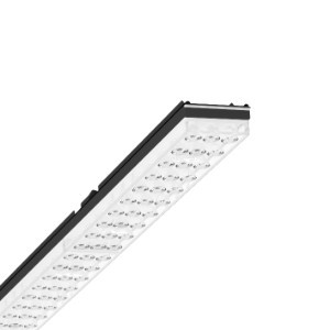 Geräteträger aus verzinktem, profiliertem Stahlblech mit Zinkauflage kombiniert mit Polyesterharzlack gewährleisten einen guten Korrosionschutz, Werkzeuglose Befestigung mit design-integrierten Druckverschlüssen gewährleisten einen Diebstahl- und Demontageschutz. Integrierte Stirnseiten aus Kunststoff mit Dichtlippen und eine umlaufend geschlossene Dichtung zur Tragschiene für Schutzart bis IP64. Gehäusefarbe schwarz RAL 9005. Lichtverteilung direkt doppelt asymmetrisch strahlend mittels Individual.Lens.Optic aus Kunststoff PMMA, die Einzellinsenoptik enthält eine transparente Dichtung, sorgt für eine hohe Montagefreundlichkeit und ist wartungsfreundlich durch leicht zu reinigende Oberfläche. Der Rhythmus der 3-reihigen Einzellinsen-Anordnung ist innerhalb und Geräteträger übergreifend perfekt aufeinander abgestimmt und gewährleistet ein homogenes Erscheinungsbild im Objekt.