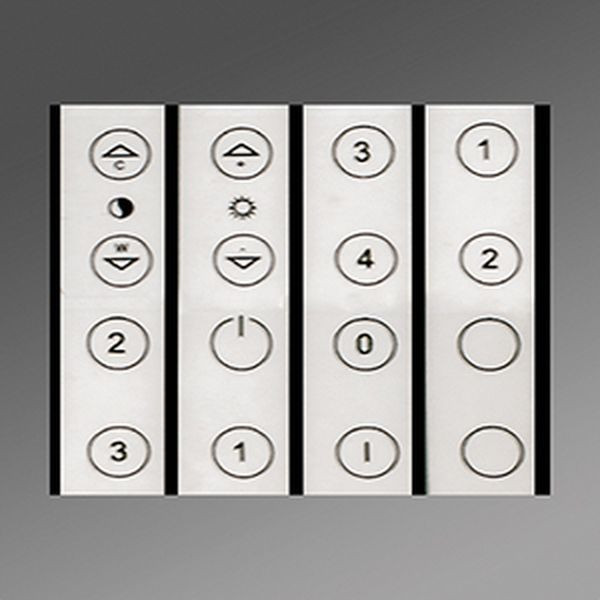 Selbstklebende, transparente Etiketten. Für Bluetooth Wandtaster LC-RX FLEX BT PB 2W und 4W, Diverse Symbole für ein/aus, Szenen, Dimmen, Farbänderung und freie Beschriftung, Wischfest und UV-stabil, 2x8 Etiketten für Wippen.