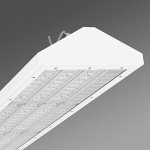 Stahlblechgehäuse pulverlackiert, Gehäuse in schmutzabweisender Satteldach Optik. Rückseitig zwei M8 Einziehgewinde zur Befestigung für Gewindestangen oder Kettenabhängung mit Augenschrauben. Gehäusefarbe verkehrsweiß RAL 9016. Lichtverteilung direkt tief-/breitstrahlend mittels Individual.Lens.Optic aus transparenter Kunststoffscheibe aus PMMA, resistent gegen herkömmliche Reinigungsmittel.