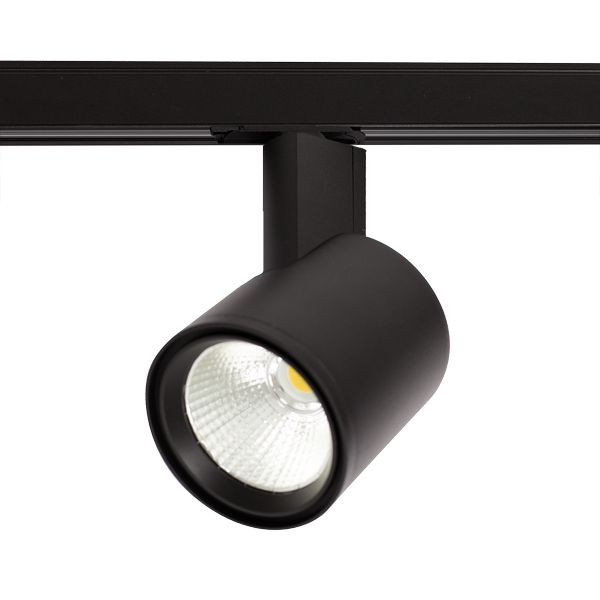 LED Stromschienenstrahler, kompakte Strahler-Einheit aus Aluminium-Druckguss mit Treiber im Gelenkarm designintegriert, Gehäuse pulverbeschichtet. Gehäusefarbe schwarz RAL 9005. Lichtverteilung direkt tiefstrahlend mittels MIRO-SILVER® Reflektor facettiert hochglänzend aus MIRO-SILVER Aluminium, hocheffizient, mit einem Reflexionsgrad von 99,8%, Sicherheitsglasscheibe klar, 30° Reflektor. Elektronischer LED Treiber integriert, Anschluss über Global Trac 3-Phasen-Stromschienen-Adapter,.