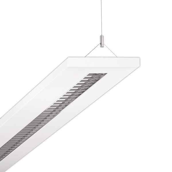 Stahlblechgehäuse, flacher rechteckiger Querschnitt, sichtbare Bauhöhe 26mm, Stirnseiten aus Stahl, Gehäusefarbe verkehrsweiß RAL 9016. Lichtverteilung direkt/indirekt strahlend mittels MIRO-SILVER® Micro-Parabolraster seidenmatt aus Aluminium, reflexionsverstärktem Aluminium-Parabolraster seidenmatt mit Niederquerschnitts-Lamellen, selbstrastend. Geeignet für Bildschirmarbeitsplätze, rundumentblendet 65° < 1000 cd/qm nach aktueller Norm DIN-EN 12464-1. Elektrischer Anschluss über integrierte transparente Anschlussleitung 3x0,75mm², Länge 1900mm, Leitungsenden abgemantelt.