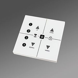 Bluetooth 5.0 Touch Panel. Wand-/Dosenmontage, IP20, Betriebsspannung 220-240VAC 50/60Hz, Tasten für Dimmen auf/ab, Farbe kalt/warm, ein/aus, 4 Szenen, Automatik, Tasten hinterleuchtet, haptisches/akustisches Feedback, einstellbar, integrierte Echtzeituhr, Vernetzbar mit weiteren Bluetooth 5 SIG Mesh Geräten, Konfiguration über Bluetooth per Koolmesh App, Gehäusefarbe weiß.
