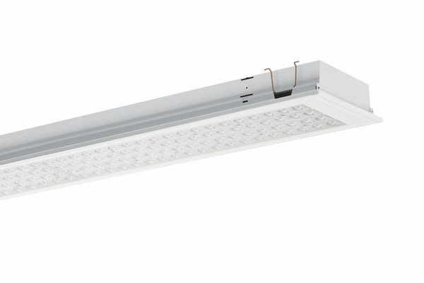 Deckenleuchte der LENSES-Produktfamilie. Lichtlenkung durch Linse, Ausstrahlungscharakteristik symmetrisch, breitstrahlend, Lichtaustritt direkt. Leuchtmittel LED-M eingebaut, Austausch durch Fachkraft möglich. Die Leuchte generiert einen Bemessungslichtstrom von 5160 lm in Lichtfarbe 840, Lichtstrom einstellbar: Nein. Die hohe LED-Lebensdauer ermöglicht einen langen Einsatz bei gleichbleibender Beleuchtungsgüte. Hohe Lichtqualität durch eine Farborttoleranz von < 3 SDCM. Gehäuse aus Stahl, verkehrsweiß, ähnlich RAL 9016, Schutzart IP20. Abdeckung aus PMMA klar. Einbau in Metallpaneeldecken parallel zu den Paneelen mit entsprechendem Befestigungszubehör. Nicht für Decken mit Füllstreifen geeignet. Mit elektronischem Betriebsgerät On/Off. Austausch durch Fachkraft möglich. Nennspannung 220 - 240 V AC/DC 50 - 60 Hz.