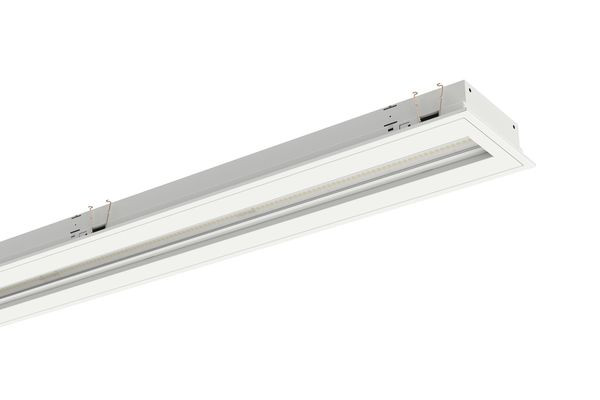 Deckenleuchte der EL-Produktfamilie. Lichtlenkung durch Abdeckung längsprismatisch, Ausstrahlungscharakteristik asymmetrisch, schrägstrahlend, Lichtaustritt direkt. Leuchtmittel LED-M eingebaut, Austausch durch Fachkraft möglich. Die Leuchte generiert einen Bemessungslichtstrom von 4340 lm in Lichtfarbe 840, Lichtstrom einstellbar: Nein. Die hohe LED-Lebensdauer ermöglicht einen langen Einsatz bei gleichbleibender Beleuchtungsgüte. Hohe Lichtqualität durch eine Farborttoleranz von < 3 SDCM. Gehäuse aus Stahl, verkehrsweiß, ähnlich RAL 9016, Schutzart IP20. Abdeckung aus PMMA strukturiert. Einbau in verschiedene Deckensysteme mit entsprechendem Befestigungssatz, oder Einlegemontage in Deckensysteme mit sichtbaren Tragschienen und eingelegten Deckenplatten. Für die Einlegemontage ist kein zusätzliches Befestigungszubehör erforderlich. Mit elektronischem Betriebsgerät On/Off. Austausch durch Fachkraft möglich. Nennspannung 220 - 240 V AC/DC 50 - 60 Hz.