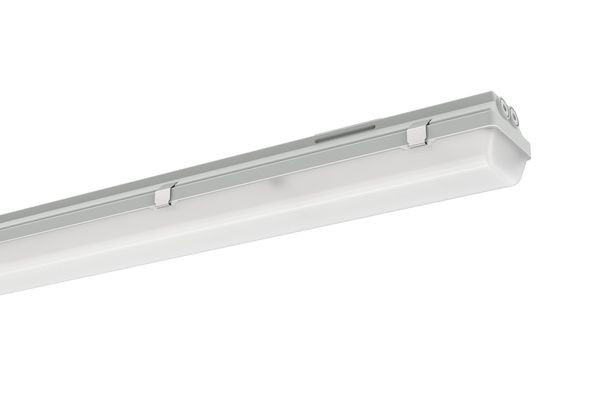 Deckenleuchte der PFLO-Produktfamilie. Lichtlenkung durch Abdeckung längsprismatisch, Ausstrahlungscharakteristik symmetrisch, diffus strahlend, Lichtaustritt direkt. Leuchtmittel LED-M eingebaut, Austausch durch Fachkraft möglich. Die Leuchte generiert einen Bemessungslichtstrom von 4520 lm in Lichtfarbe 840, Lichtstrom einstellbar: in Stufen. Die hohe LED-Lebensdauer ermöglicht einen langen Einsatz bei gleichbleibender Beleuchtungsgüte. Hohe Lichtqualität durch eine Farborttoleranz von < 3 SDCM. Lichtstrom in Stufen einstellbar von 2600 - 4520 lm. Gehäuse aus Kunststoff, grau, Schutzart IP66. Abdeckung aus PC strukturiert. Deckenmontage über Befestigungsklammern aus Edelstahl, an der Leuchte einrastbar. Pendelmontage über Befestigungsbügel aus Edelstahldraht, an den Befestigungsklammern einrastbar (der Leuchte beigelegt). Waagrechte und senkrechte Wandmontage möglich. Mit elektronischem Betriebsgerät xFlex. Austausch durch Fachkraft möglich. Nennspannung 220 - 240 V AC/DC 50 - 60 Hz.