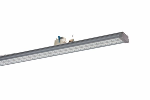 Geräteträger VLGFL der RIDI LINIA-Produktfamilie. Lichtlenkung durch Linse, Ausstrahlungscharakteristik symmetrisch, breitstrahlend, Lichtaustritt direkt. Leuchtmittel LED-M eingebaut, Austausch durch Fachkraft möglich. Die Leuchte generiert einen Bemessungslichtstrom von 14800 lm in Lichtfarbe 840. Die hohe LED-Lebensdauer ermöglicht einen langen Einsatz bei gleichbleibender Beleuchtungsgüte. Hohe Lichtqualität durch eine Farborttoleranz von < 3 SDCM. Lichtstrom in Stufen einstellbar von 7400 - 14800 lm. Gehäuse aus Aluminium, silber, ähnlich RAL 9006, Schutzart IP54. Einfaches Einclipsen zur elektrischen Kontaktierung und mechanischen Befestigung im systemgebundenem LINIA Tragschienensystem. Mit elektronischem Betriebsgerät xFlex. Austausch durch Fachkraft möglich. Nennspannung 220 - 240 V AC/DC 50 - 60 Hz.