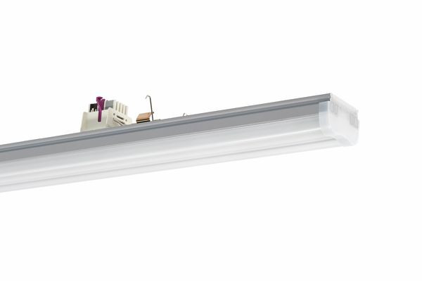 Geräteträger VLGFP der RIDI LINIA-Produktfamilie. Lichtlenkung durch Abdeckung opal, Ausstrahlungscharakteristik symmetrisch, diffus strahlend, Lichtaustritt direkt. Leuchtmittel LED-M eingebaut, Austausch durch Fachkraft möglich. Die Leuchte generiert einen Bemessungslichtstrom von 8000 lm in Lichtfarbe 850. Die hohe LED-Lebensdauer ermöglicht einen langen Einsatz bei gleichbleibender Beleuchtungsgüte. Hohe Lichtqualität durch eine Farborttoleranz von < 3 SDCM. Gehäuse aus Aluminium, silber, ähnlich RAL 9006, Schutzart IP40. Einfaches Einclipsen zur elektrischen Kontaktierung und mechanischen Befestigung im systemgebundenem LINIA Tragschienensystem. Mit elektronischem Betriebsgerät DALI-2. Austausch durch Fachkraft möglich. Nennspannung 220 - 240 V AC/DC 50 - 60 Hz.