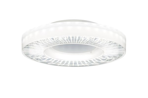 Deckenleuchte der IRIS-Produktfamilie. Lichtlenkung durch Abdeckung radialprismatisch, Ausstrahlungscharakteristik symmetrisch, breitstrahlend, Lichtaustritt direkt/indirekt. Leuchtmittel LED-M eingebaut, Austausch durch Fachkraft möglich. Die Leuchte generiert einen Bemessungslichtstrom von 4510 lm in Lichtfarbe 8TW, Lichtstrom einstellbar: stufenlos. Die hohe LED-Lebensdauer ermöglicht einen langen Einsatz bei gleichbleibender Beleuchtungsgüte. Hohe Lichtqualität durch eine Farborttoleranz von . Gehäuse aus Kunststoff, transparent, Schutzart IP20. Mit elektronischem Betriebsgerät DALI-2. Austausch durch Fachkraft möglich. Nennspannung 220 - 240 V AC/DC 50 - 60 Hz.