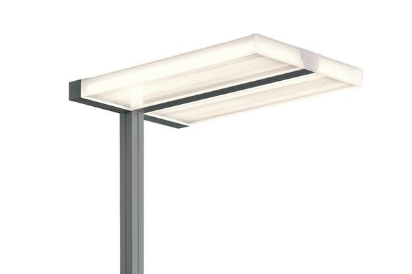 Stehleuchte der HLM-Produktfamilie. Lichtlenkung durch Abdeckung mikroprismatisch, Ausstrahlungscharakteristik symmetrisch, breitstrahlend, Lichtaustritt direkt/indirekt. Leuchtmittel LED-M eingebaut, Austausch durch Fachkraft möglich. Die Leuchte generiert einen Bemessungslichtstrom von 14300 lm in Lichtfarbe 840, Lichtstrom einstellbar: stufenlos. Die hohe LED-Lebensdauer ermöglicht einen langen Einsatz bei gleichbleibender Beleuchtungsgüte. Hohe Lichtqualität durch eine Farborttoleranz von < 3 SDCM. Gehäuse aus Aluminium, silber, Schutzart IP20. Abdeckung aus PMMA klar