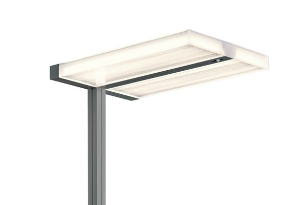 Stehleuchte der HLM-Produktfamilie. Lichtlenkung durch Abdeckung mikroprismatisch, Ausstrahlungscharakteristik symmetrisch, breitstrahlend, Lichtaustritt direkt/indirekt. Leuchtmittel LED-M eingebaut, Austausch durch Fachkraft möglich. Die Leuchte generiert einen Bemessungslichtstrom von 14300 lm in Lichtfarbe 840, Lichtstrom einstellbar: stufenlos. Die hohe LED-Lebensdauer ermöglicht einen langen Einsatz bei gleichbleibender Beleuchtungsgüte. Hohe Lichtqualität durch eine Farborttoleranz von < 3 SDCM. Gehäuse aus Aluminium, silber, Schutzart IP20. Abdeckung aus PMMA klar