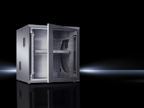Gehäuse in Flat-Pack-Verpackung, 1 Wandteil, 2 Grundträger, 2 Dach-/Bodenbleche, mit Ausbrüchen zur Kabeleinführung, mit Bürstenleisten, 2 x 19"-Profilschienen (bei 6 HE und 9 HE), 1 x 19"-Montagerahmen (ab 12 HE), 4 Nivellierfüße (ab 12 HE), 2 Seitenwände, abschließbar, 1 Sichttür, abschließbar, Türanschlag frei wählbar. Verbindungselemente zur werkzeuglosen Schnellmontage.