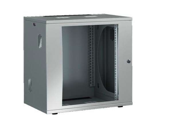 Gehäuse in Flat-Pack-Verpackung, 1 Wandteil, 2 Grundträger, 2 Dach-/Bodenbleche, mit Ausbrüchen zur Kabeleinführung, mit Bürstenleisten, 2 x 19"-Profilschienen (bei 6 HE und 9 HE), 1 x 19"-Montagerahmen (ab 12 HE), 4 Nivellierfüße (ab 12 HE), 2 Seitenwände, abschließbar, 1 Sichttür, abschließbar, Türanschlag frei wählbar. Verbindungselemente zur werkzeuglosen Schnellmontage.