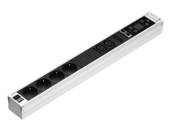 DK PSM Messmodul, zur modularen PSM Stromverteilung. Belegt 2 Steckplätze in der Stromschiene. Ausgang: 4x Schuko, CEE 7/3, 2x C13, Eingang: 207 V - 250 V, 16 A, (max. 3680 W)