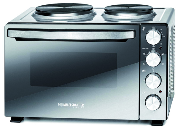 2 Kochstellen (145 mm Ø - 750 W, 180 mm Ø - 1000 W), Gußheizplatten, motorischer Drehspieß, 3 Einschubebenen, Ober-/Unterhitze, Oberhitze, Ober-/Unterhitze mit Umluft, Oberhitze mit Umluft, Unterhitze mit Umluft