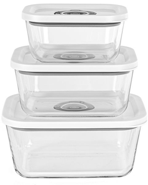 3-er Set: 350 ml, 670 ml und 1100 ml, aus Borosilikat Glas, für Temperaturen von - 18 °C bis + 230 °C, jeweils mit stabilem Kunststoffdeckel mit Datumsanzeige, inklusive: Vakuumierschlauch mit Adapter und 1 Zusatz-Adapter