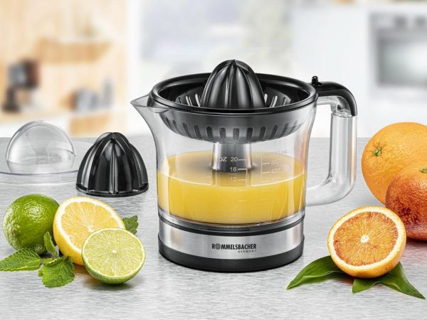 abnehmbarer, transparenter Saftbehälter 0,6 l mit Skalierung, BPA-frei, leichtgängige Ein-/Ausschaltung über Presskegel, 2 Presskegel für große bzw. kleine Früchte, Rechts-/Linkslauf, separate Einstellung des Fruchtfleischgehalts, Staubschutzdeckel