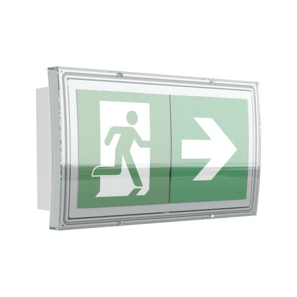 Kunststoff LED Rettungszeichenleuchte mit konvex geformter Haube zur Wandmontage. Zur Montageerleichterung sind Nivelierschrauben integriert, um unebene Untergründe auszugleichen. Das Piktogrammset wird innenliegend eingesteckt und lösungsmittelfrei befestigt. Steuerung und Überwachung über zentrales 24-Volt-Low Power System. Planungssicherheit ist durch werkzeuglosen, variablen Einsatz der Piktogramme vor Ort gegeben. Die Piktogramme entsprechend DIN ISO 7010 (2x Mann in der Tür und zwei Pfeile) sind standardmäßig im Lieferumfang enthalten.