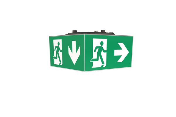 Moderne Rettungszeichen-Würfelleuchte zur Kennzeichnung der Flucht- und Rettungswege mit montagefreundlichem Bajonettverschluss. Sie kann direkt an die Decke montiert oder mit entsprechendem Zubehör abgehängt werden. Durch die Würfelform ist diese Kunststoffleuchte von vier Seiten gut erkennbar. Ideal für Anwendungen bei Wegkreuzungen, wie z.B. in Kaufhäusern mit Regalgängen. Automatische Überwachung der Sicherheitsleuchte mit SelfControl. Planungssicherheit wird durch logisch vorgegebene aufgedruckte Piktogramme geboten. Die aufgebrachten Piktogramme entsprechend DIN ISO 7010 (Pfeil rechts, links und unten).