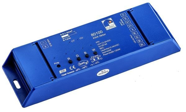 Konstantspannung 4 Kanäle einfarbig oder mehrfarbig einstellbar über Software Systemvoraussetzung : ETS 3.0F oder höher 4 unabhängige Kanäle 5A pro Kanal IP20 Schutz gegen Kurzschluss,Überspannung und Übertemperatur manuelle Einstellung am Gerät möglich optische Warnung per LED für Übertemperatur und Überspannung optische LED Anzeige für Normalbetrieb und Adresseinstellung EN60529 Leistung: 4x60(12V),4x120W(24V) Input und Output 12V-24V DC Maße: 166x53,4x23mm Temperaturbereich: -20°C bis +50°C