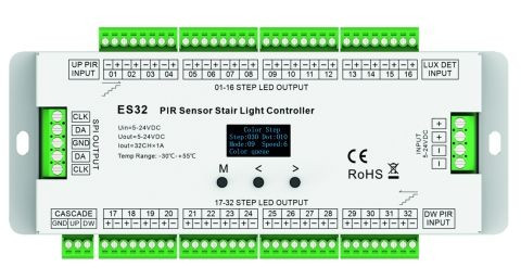 LED-Treppenlichtcontroller für bis zu 32 Stufen einzeln ansteuerbar für die Innenanwendung, IP20 32 Kanäle, 1 A Schutzklasse III, CE, RoHS Input: 5 V - 24 V DC Output: 5 V - 24 V DC (PWM) Leistung: 160 W (5 V), 384 W (12 V), 768 W (24 V) LxBxH in mm: 186 x 86 x 25,5 mit 2 PIR Sensoren und einem Helligkeitssensor mehrere Programme und Tasterfunktion abrufbar Temperaturbereich -30°C bis +40°C Lieferumfang: 1 LED-Treppenlichtcontroller, 2 PIR Sensoren mit 1,2 m Leitung, 1 Helligkeitssensor mit 0,3 m Leitung, 2 Verlängerungsleitungen 5 m für PIR Sensor