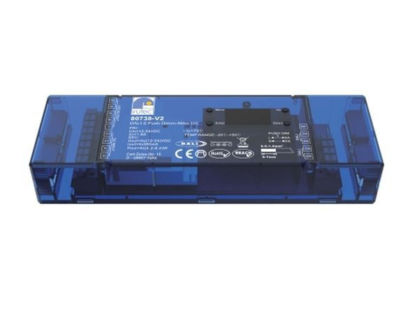 DALI-2-DT8-Dimmer, 4-Kanal-PWM-Ausgang, integrierte DALI-Master-Funktion Dank OLED-Display-Oberfläche ist eine einfache und schnelle Installation möglich Alle DT8-Farbtypen in einem Gerät: XY, Tc, RGBW, Push-Dim kompatibel für einfarbige Beleuchtung Jedes Gerät wird über eine einzige DALI-Adresse angesteuert 16 Szenen können vorab am Gerät definiert und abgerufen werden 250 Hz - 30 kHz PWM-Frequenz einstellbar, sanfte und feine DT8-Farbsteuerung Am Gerät kann direkt ein Dimmwert und eine manuelle Farbkontrolle vorgenommen werden (Stand-Alone Funktion) Einschalt-, Dimm- und Fehlerverhalten direkt am Gerät einstellbar Kompatibel mit universellen DALI-Mastern, die DT8-Befehle unterstützen Entspricht der IEC 62386-209: 2011 Für die Innenanwendung, IP20 Gerätetyp: DT8 Schutzklasse III, CE, RoHS, REACH Temperaturbereich: -20°C bis +50°C Eingangsspannung 12V DC - 24V DC Ausgangsspannung: 12V DC - 24V DC (PWM) Ausgangsstrom: 350 mA DC Leistung: 4 x 4,2W (12V), 4x 8,4W (24V) LxBxH in mm: 170 x 53,5 x 28,8