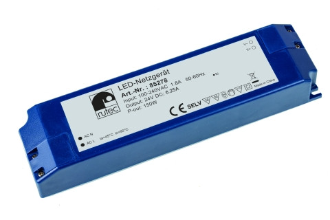 rutec Netzgerät, Konstantspannung für die Innenanwendung, IP20 mit Schraubklemmen und Zugentlastung CE, REACH, RoHS, MM, SELV, aktiv PFC Schutz gegen Kurzschluss, Überlast, Überspannung und Übertemperatur Leitungsquerschnitt Schraubklemmen: 0,75 - 1,5 qmm Gehäuse: Kunststoff Eingangsspannung: 100-240 V AC Leistung: 150 Watt Ausgangsstrom: 6,25 A Ausgangsspannung: 24 V DC LxBxH in mm: 204 x 53,5 x 30 Temperaturbereich: -20 bis +45°C Primärseitig nicht dimmbar
