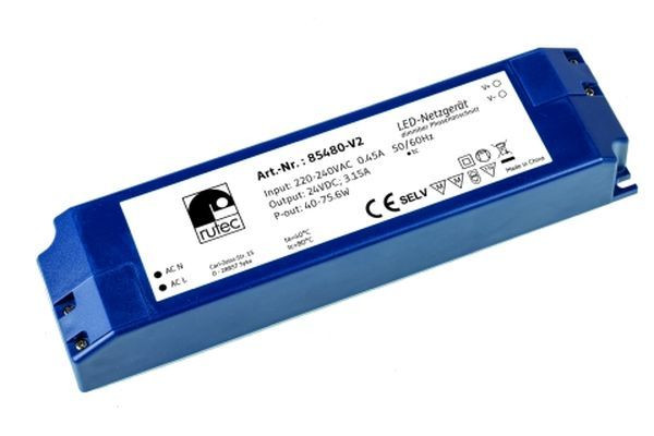 rutec dimmbares LED-Netzgerät, Konstantspannung für die Innenanwendung, IP20 mit Schraubklemmen und Zugentlastung CE, REACH, RoHS, MM, SELV Schutz gegen Kurzschluss, Überlast, Überspannung und Übertemperatur Leitungsquerschnitt Schraubklemmen: 0,5 - 1,5 qmm Gehäuse: Kunststoff Eingangsspannung: 220-240 V AC Leistung: 40-75,6 Watt Ausgangsstrom: 3,15 A Ausgangsspannung: 24 V DC LxBxH in mm: 204 x 53,5 x 30 Temperaturbereich: -20 bis +40°C Primärseitig dimmbar über Phasenanschnitt Abhängig von der Elektronik der Phasendimmer kann der Dimmbereich im oberen- und/oder unteren Dimmbereich eingeschränkt sein (Schwellwerte sind entsprechend der verwendeten Dimmelektronik zu entnehmen).