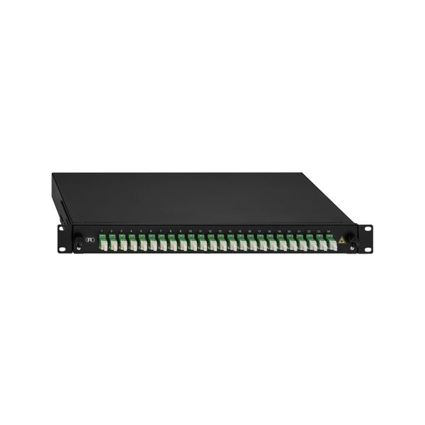"BasicLine-Spleissbox, ausziehbar, 19""/1HE, 24xLC-D, OS2 APC, grün"; - pulverbeschichtetes Stahlblechgehäuse; - werkseitige Portkennzeichnung; - ausziehbare Schubladenlösung; - im geöffneten Zustand nach unten neigbar; - mit frontseitigem Schnellverschluss (Push-Pull); - mit 4 Spleisskassetten zur Aufnahme von 12 oder 24 Pigtails; - eingelegter Crimpspleisshalter; - vorbereitet mit im 12-er - Bündel eingelegten Pigtails inkl. 24 x LC-D-Keramik-Kupplungen; - 48 LC-Faserpigtails E9/125 µm, 2 m, MM PC, Grade B; - mit Messprotokoll für alle Fasern inkl. Seriennummer; - 2 x rückseitige PG13,5/M20-Verschraubungen (je 2 x rechts/links); - 1 x PG13,5/M20-Verschraubung im Lieferumfang; - schwarz (ähnlich RAL 9005)