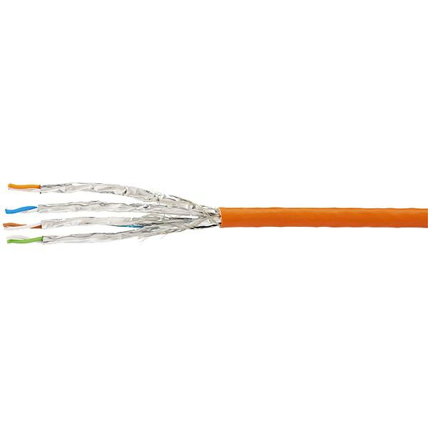 Cat.7-Datenkabel, geschirmt, S/FTP, FRNC, LSOH, 1.000 m, orange (ähnlich RAL 2003); - S/FTP-Ausführung; - Class F-Performance (600 MHz / 10 Gbit/s); - 865 MHz gem. IEC 15018 (Cat. TV); - Brandverhalten/Euroklasse: EN13501-6:CCA; - Mantelmaterial: LSOH, FRNC; - AWG 23, Cu-Draht, blank; - Paarschirmung: Alu PETP-Folie; - Kabelschirm: Cu-Geflecht, verzinnt; - entsprechend nachfolgender Normanforderungen:; - DIN EN 50173-1; - ISO/IEC 11801; - PoE+ tauglich gem. IEEE 802.3at; - GHMT zertifiziert