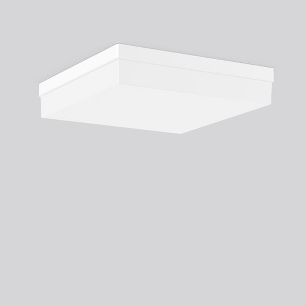 Flache quadratische Anbauleuchte. Armatur Kunststoff. Diffusor Kunststoff (Polypropylen) opal seidenmatt. Befestigung des Diffusors mit Federsystem. IP 43 Deckenmontage, IP 44 Wandmontage.