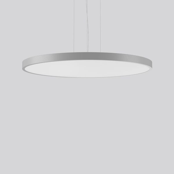 Dekorative runde LED Pendel-Flächenleuchte. Flacher nahtloser Rahmen Aluminium-Strangpressprofil pulverbeschichtet. Abdeckung Stahlblech pulverbeschichtet. Baldachin Aluminium pulverbeschichtet. Direkter Lichtaustritt über Diffusor Kunststoff opal/prismatisch. Indirekter Lichtaustritt über flächenbündigen Diffusor aus Kunststoff satiniert. Diffusor und Lightguide aus vergilbungsfreiem Kunststoff (PMMA). Seitliche Lichteinkopplung (RZB SIDELITE-Technologie) für überdurchschnittlich homogene Leuchtdichteverteilung und randlose Ausleuchtung. Lichtaustritt direkt 70%, indirekt 30%. Tunable White Versionen dynamisch einstellbar von 2700 K bis 6500 K. Für Human Centric Lighting (HCL) in Verbindung mit RZB-Lichtmanagementsystemen geeignet. 3-Punkt Stahlseilabhängung stufenlos höhenverstellbar. Einfache Montage mit transparenter, kürzbarer Pendelleitung und Baldachin mit Magnetbefestigung. Betriebsgerät integriert.